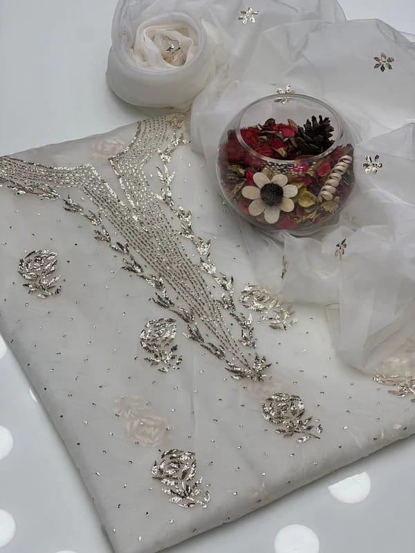 Handwork Golden Mukesh Work on organza shirt with organza dupatta.